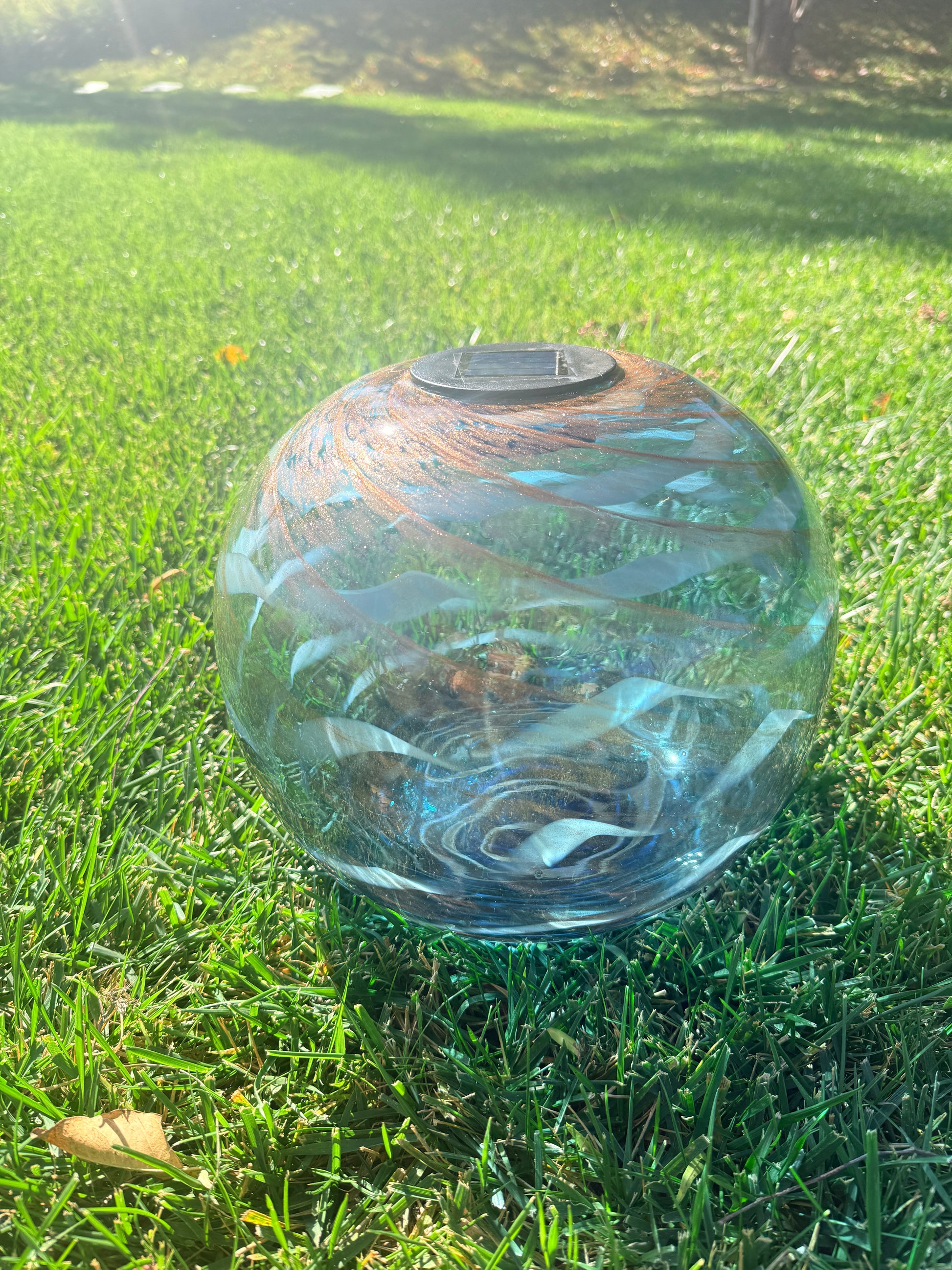 12" Hand Blown Art Glass Solar Gaze Ball Blue Swirl