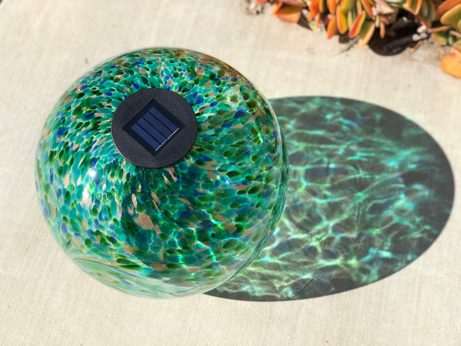 Hand Blown 12" Thick & Heavy Art Glass Solar LED gaze ball adds beautiful color during the day and shines at night. The Solar LED panel is hidden inside the ball and being recharged everyday under the sun. Just turn on the switch the first time and it will keep showing that beautiful color at night. The gaze ball operates most effectively when it has the maximum sun exposure to recharge it's battery.