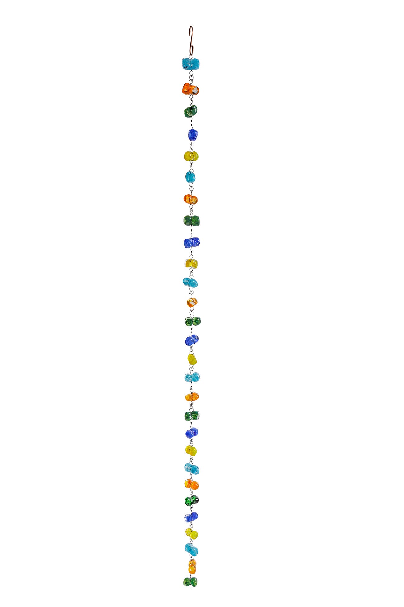 6ft Art Glass rain chain, 100% handmade with art glass nugget, 3 colors to choose from, cobalt blue, lake green and rainbow. added the new 6ft recycled art glass and rock rain chain. please note, all our rain chain do age with a protective layer of rust. if you do not wish to see the rust, you may spray a layer of anti rust spray which is available at your local hardware store
