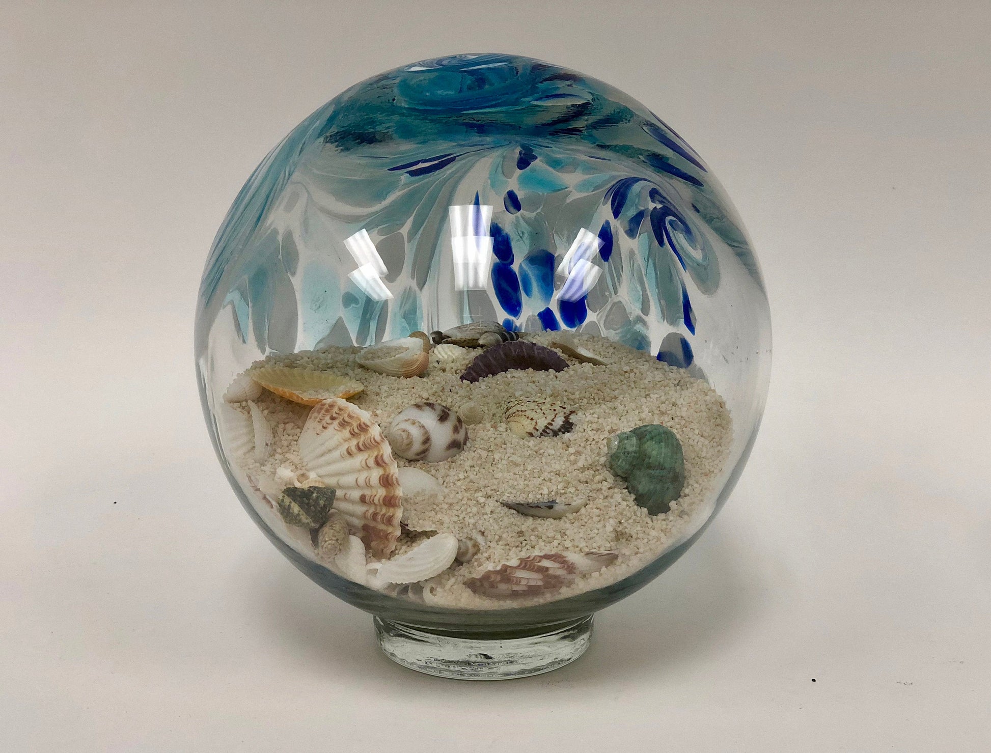 Free US Shipping~ 7" Pacific Coast Blue Sea Globe Handblown Art Glass Decor Holiday Gift with natural sea shell and sand