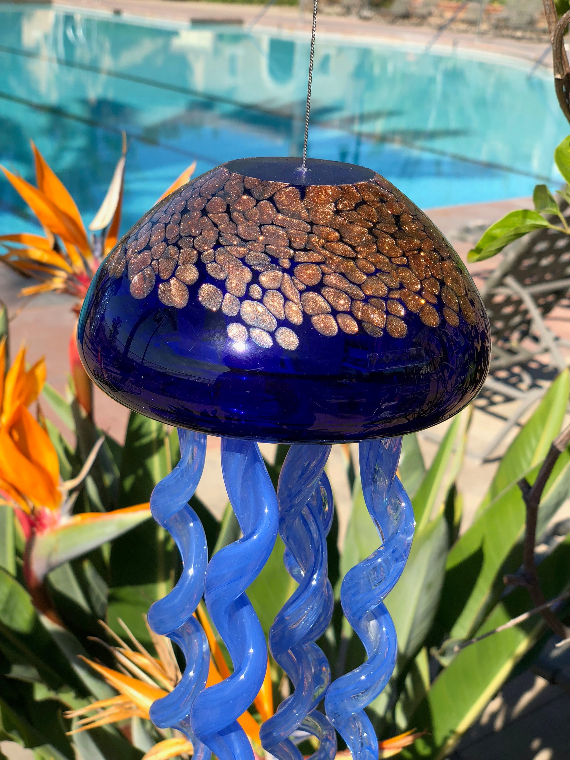 Beautifully handcrafted art glass jellyfish wind chime brings a beautiful touch to your space. Beautiful, hand blown glass bowl is deep blue with a hint of dazzling copper/golden glitter dust on top, truly remarkable when it catches the light. A hole has been drilled in the center to accommodate the jellyfish tentacles. Five hand crafted tentacles are artfully shaped and colored. This is a 100% handmade piece and did not go through any machining process. The jellyfish is supported by high quality hanging cable for durability and it comes with a brass hook to easily hook. It's approx 5 1/2" x 11". Since it's hand crafted item, each piece is beautifully unique. The tentacles are on the heavy side so slightly difficult to catch the wind, but when it does the sound is beautiful. it can also be a beautiful hanging indoor decor.