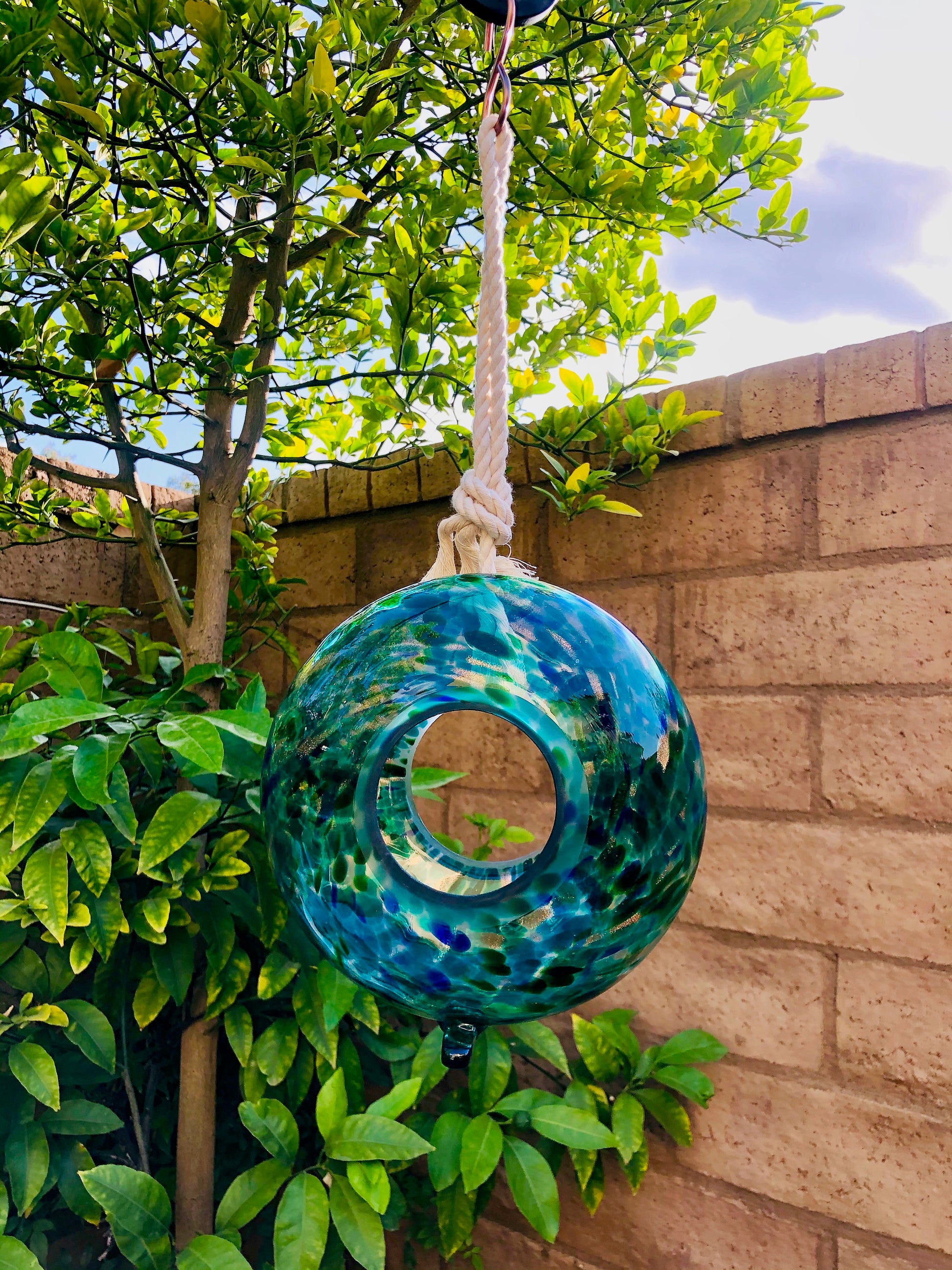 100% Handblown Thick Art Glass Bird Feeder, 3 color available. Comes with brass hook.